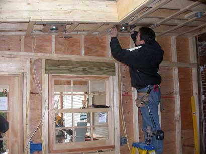 Paul installs the 3 in diameter low voltage recessed fixtures over the wet bar. The rafters on the other side of the room are not wide enough to support the other two 3 in recessed fixtures so track-mounted spots will be used instead.