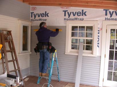 Loren start the clapboard on the rebuilt north wall