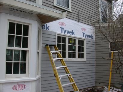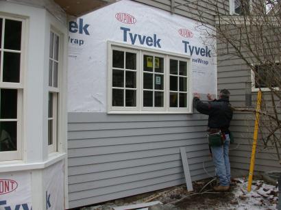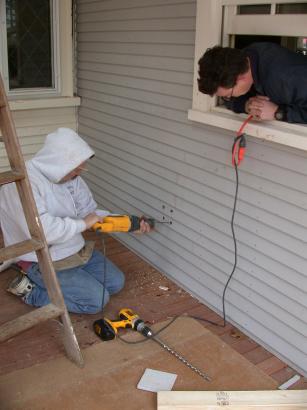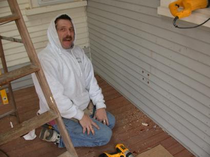 Frank continues clapboard on annex porch wall