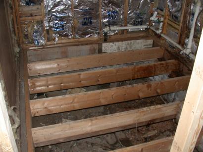 Floor of laundry room removed. Old plumbing will be removed and redone.