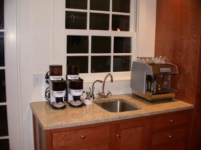 Espresso bar area ready to go as soon a small leak in the under-sink plumbing is fixed in the morning.