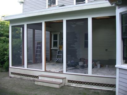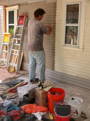 Painter starts on the porch wall.